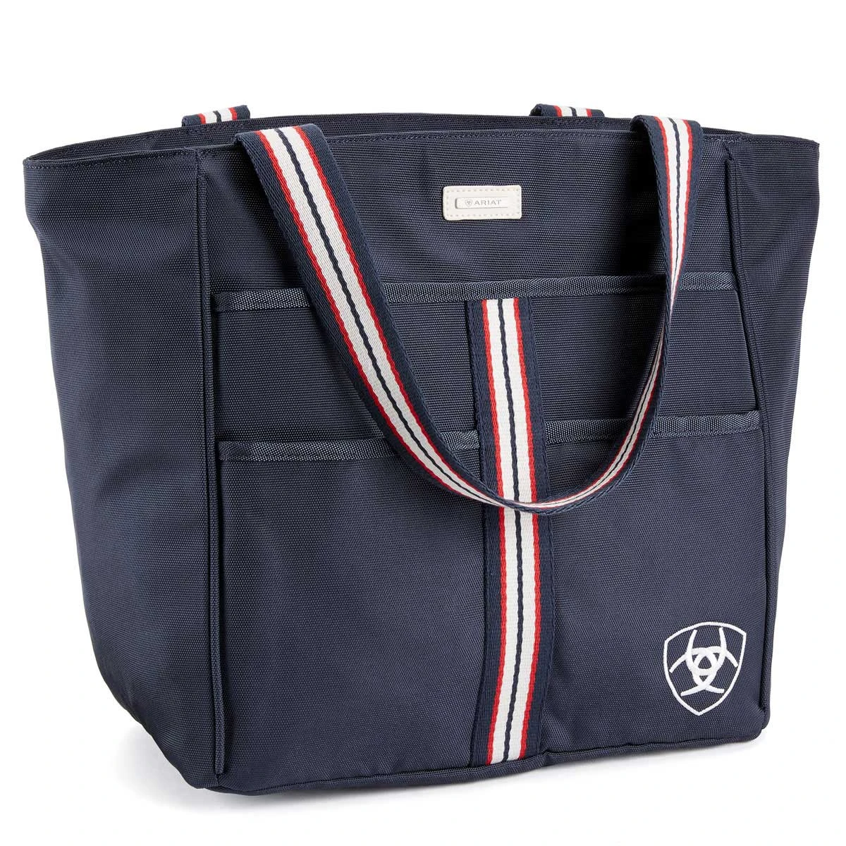 Ariat Team Tote Bag features roomy exterior drop pockets for essentials, an organizer pocket with magnetic closure to keep your items secure, equestrian pattern lining, and a large roomy interior section for storing all of your necessities. No matter what your day has in store this tote bag is equipped to handle it all, a must add tor your equestrian gear!