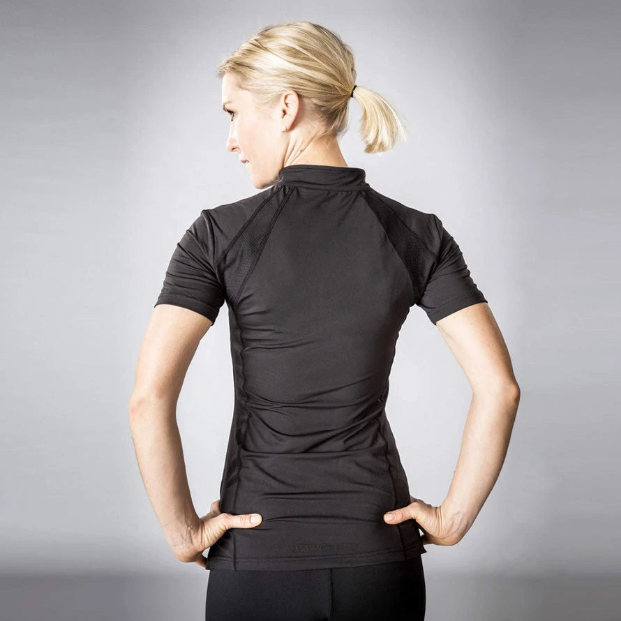 Olivia Womens Tee is slimly tailored with Iontex infrared technology. Elegantly styled half zip sport top with figure flattering fit infused with infrared energy is perfect for every occasion. Features mesh details for added ventilation, tone on tone print, and a half-zip at the front for comfort. Great for performance lifestyle the Iontex technology is lightweight, breathable and has thermal regulation properties. Great for riding in all weather conditions by helping you stay dry and it is odor-controlling effects.