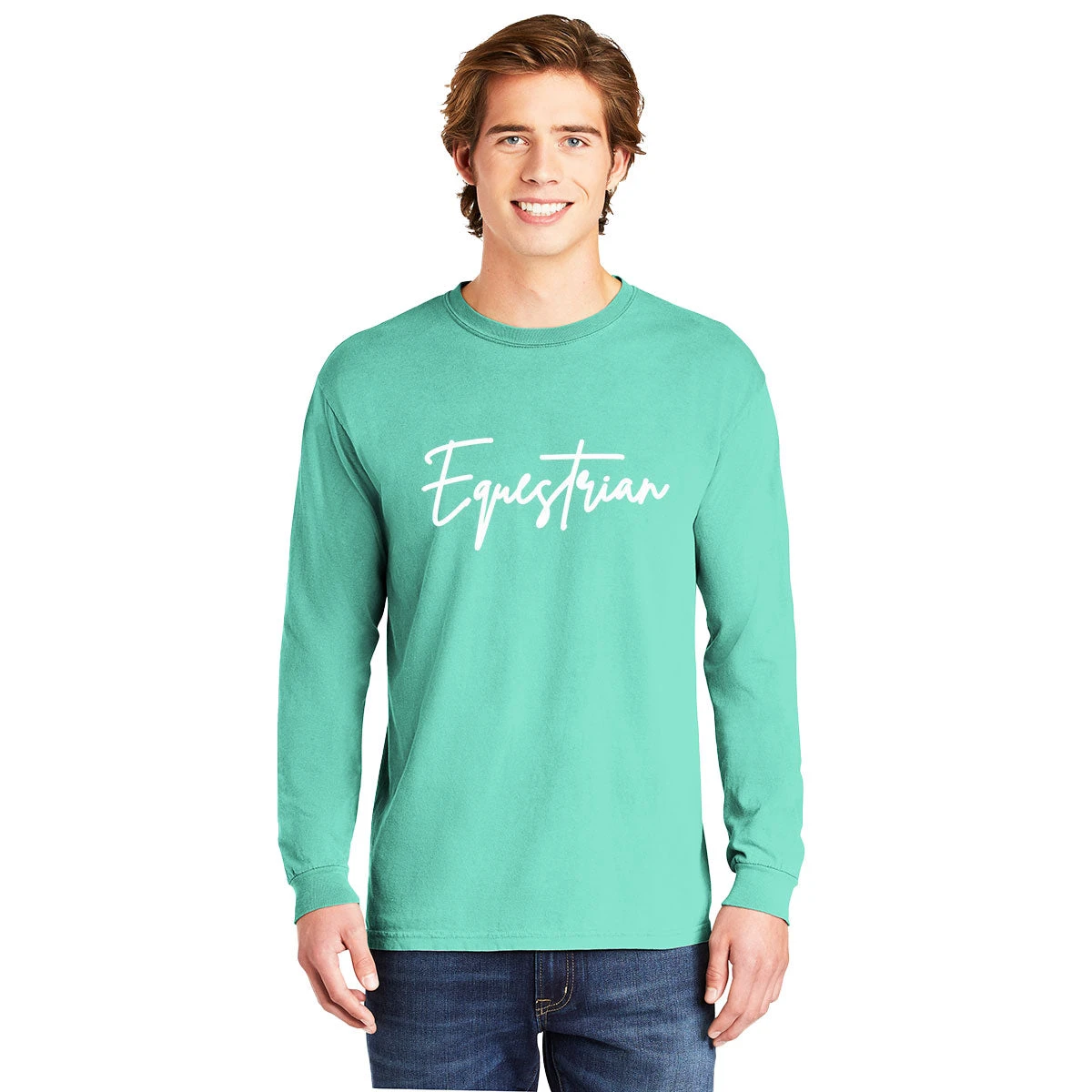 Long Sleeve T-shirt made with soft washed, garment dyed fabric. Cute Equestrian on the front by Big Dee’s Custom Equine Shop. Made from 100% US ring spun cotton, twill-taped neck and shoulders, rib knit cuffs and classic width rib collar. This long sleeve t-shirt is made with relaxed fit, tubular body.