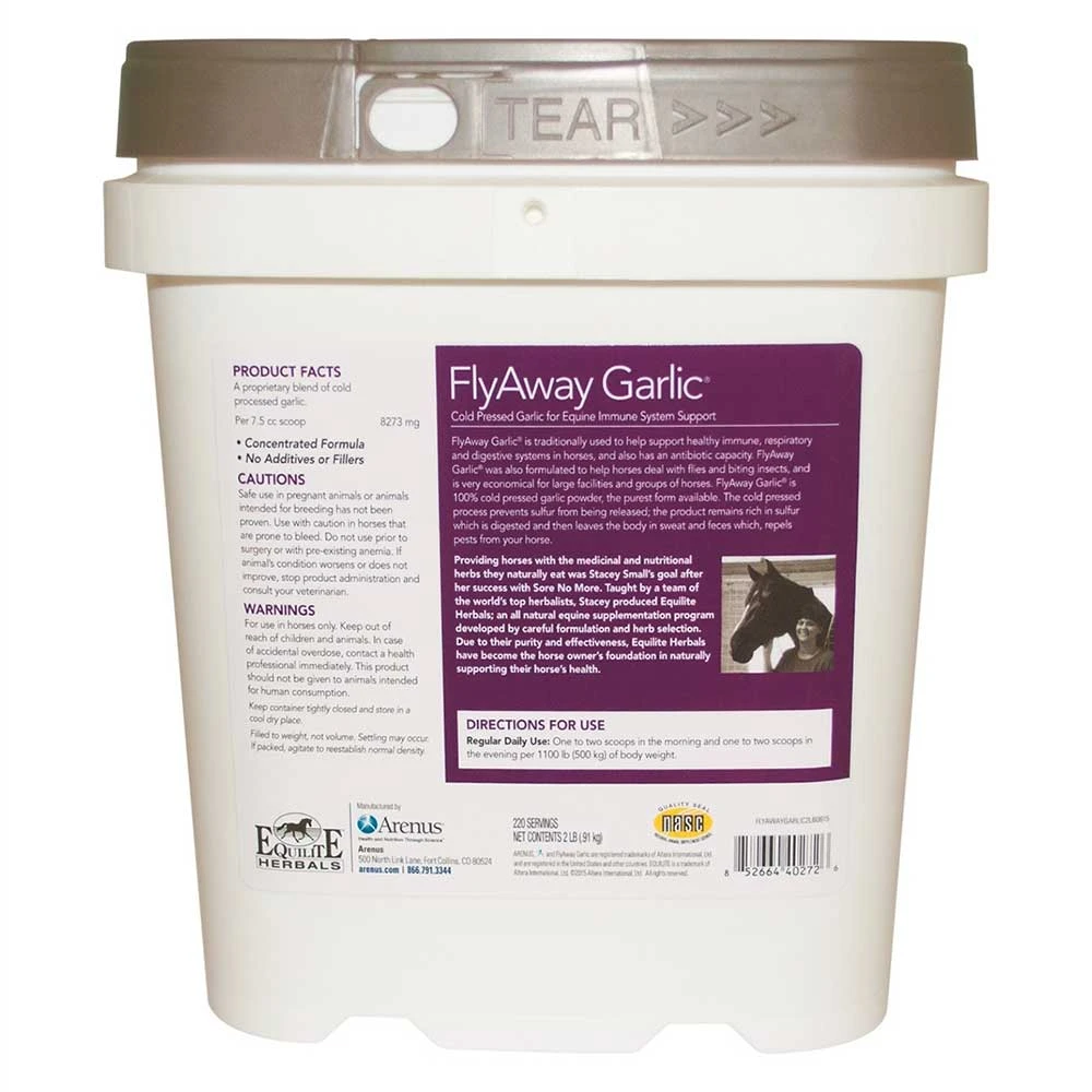 FlyAway Garlic by Equilite – Formulated to help the horse repel flies and other pests from the inside out. Also traditionally used to help support the immune, respiratory and digestive systems of the horse. Economical choice to control flies and other insects.