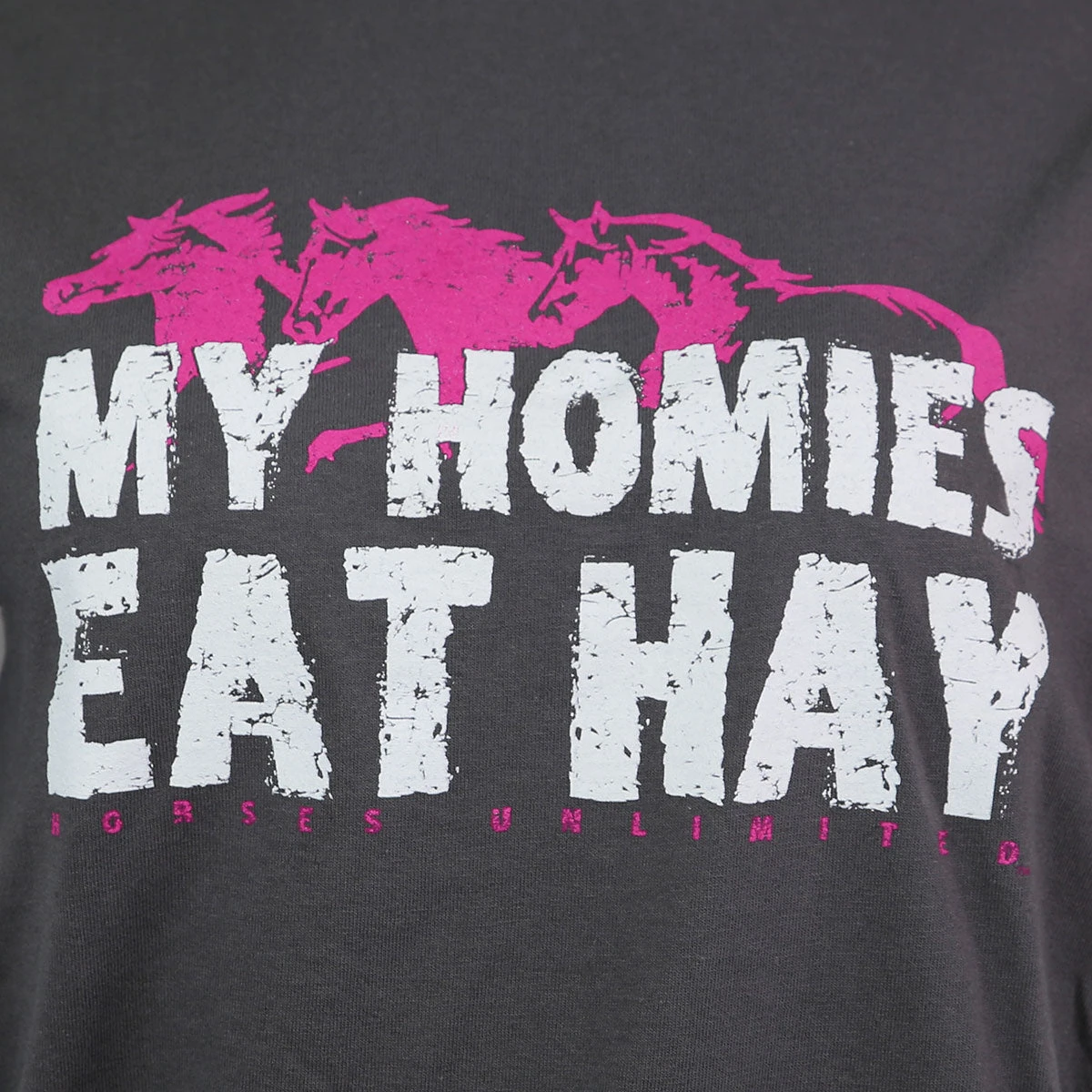 Horses Unlimited Alone Ladies Tee featuring ” My Homies Eat Hay ” screen printed on the front, will make any rancher smile! A great gift for your farm help or favorite gal who loves horses. Short sleeve tee looks great in our out of the saddle paired with jeans. This sassy graphics tee is terrific addition to any western tee collection .