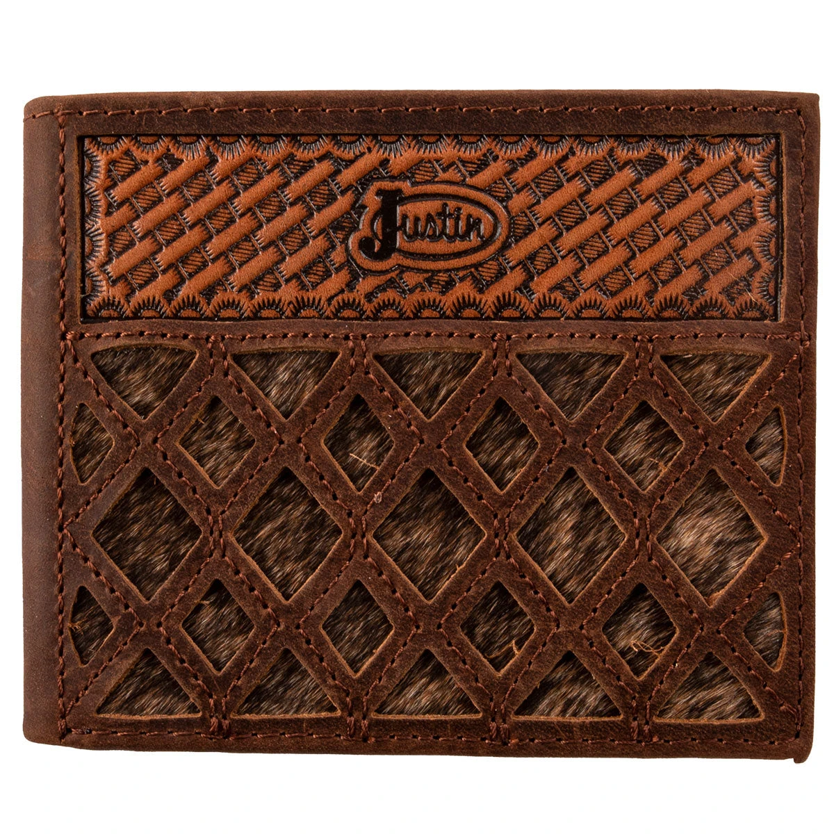 The Justin Back Pocket Bifold Mens Wallet – Brindle Inlay features a brown leather with basketweave tooling and brindle hide inlay. On the interior there are 2 open slot pockets, 6 credit card slots, 1 cash pocket and 1 license holder.