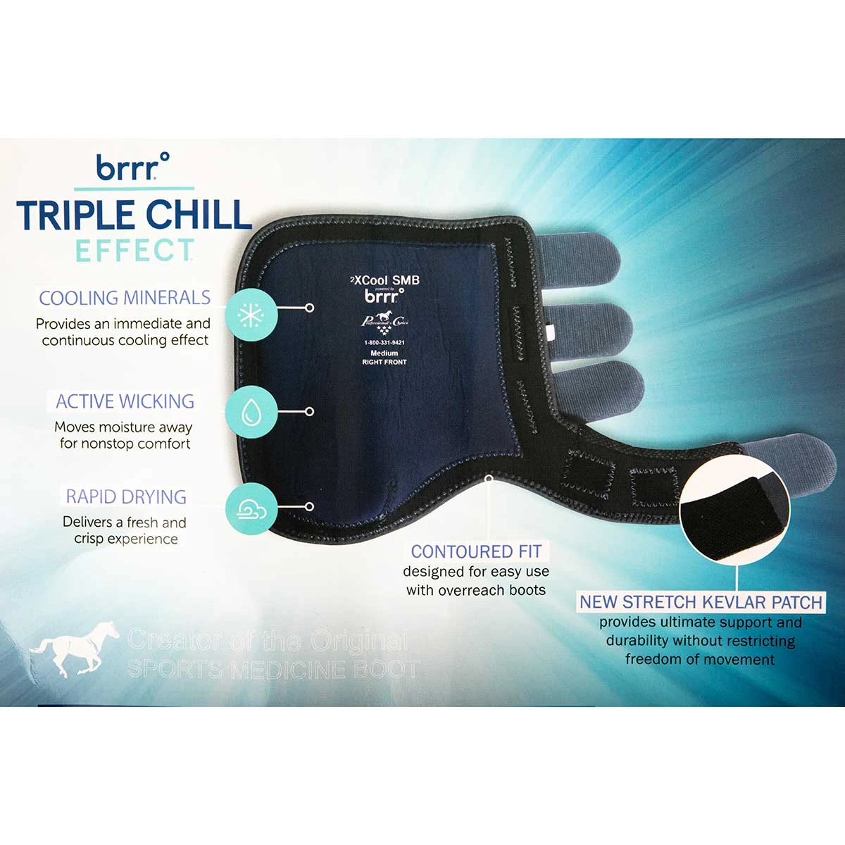The Professional’s Choice 2XCool Sports Medicine Boot was designed around cooling, comfort, and durability. This neoprene-free boot is constructed with ultra-lightweight, super-breathable materials that provide the support and 4-way stretch Professional’s Choice boots are known for. The liner of the boot is made with 2XCool performance fabric by brrr, a technologically-advanced textile that combines natural cooling minerals, active wicking, and rapid drying to create a “Triple Chill Effect” that instantly and continuously draws away heat and moisture. A new stretch Kevlar patch on the suspensory strap flexes with every step to provide ultimate support and durability without restricting freedom of movement.