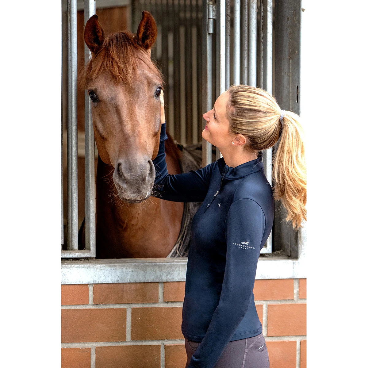 The Schockemohle Winter Page Ladies Base layer is perfect for under a vest or jacket. You will love the soft, warm fleece interior in the cooler months. Look and feel your best with the body hugging cut, glittering seams, and reflective logos. A warm, breathable shirt that gives you a nice figure while in the saddle or doing barn chores.