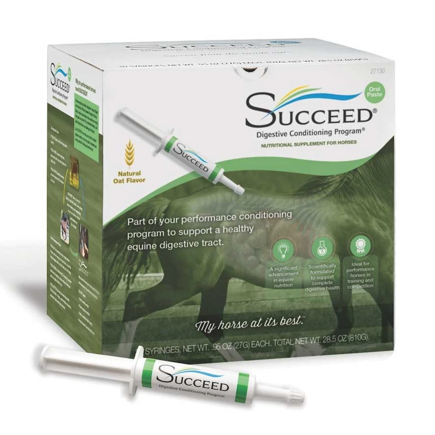 Keep your horse’s digestive health in top optimal condition with Succeed Digestive Oral Paste. With one easy-to-administer serving a day, Succeed combines a patented blend of various prebiotics, amino acids, lips, and soluble fibers to enhance and improve your horse’s digestive system and overall well being. Includes 30 single dose syringes.