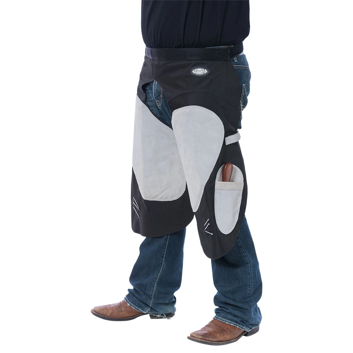 Tough 1 Professional Deluxe Farrier Apron has tool pockets, adjustable sizing, quick clip closures, heavy duty protection, plus extra padding under the suede knees for additional support and comfort.