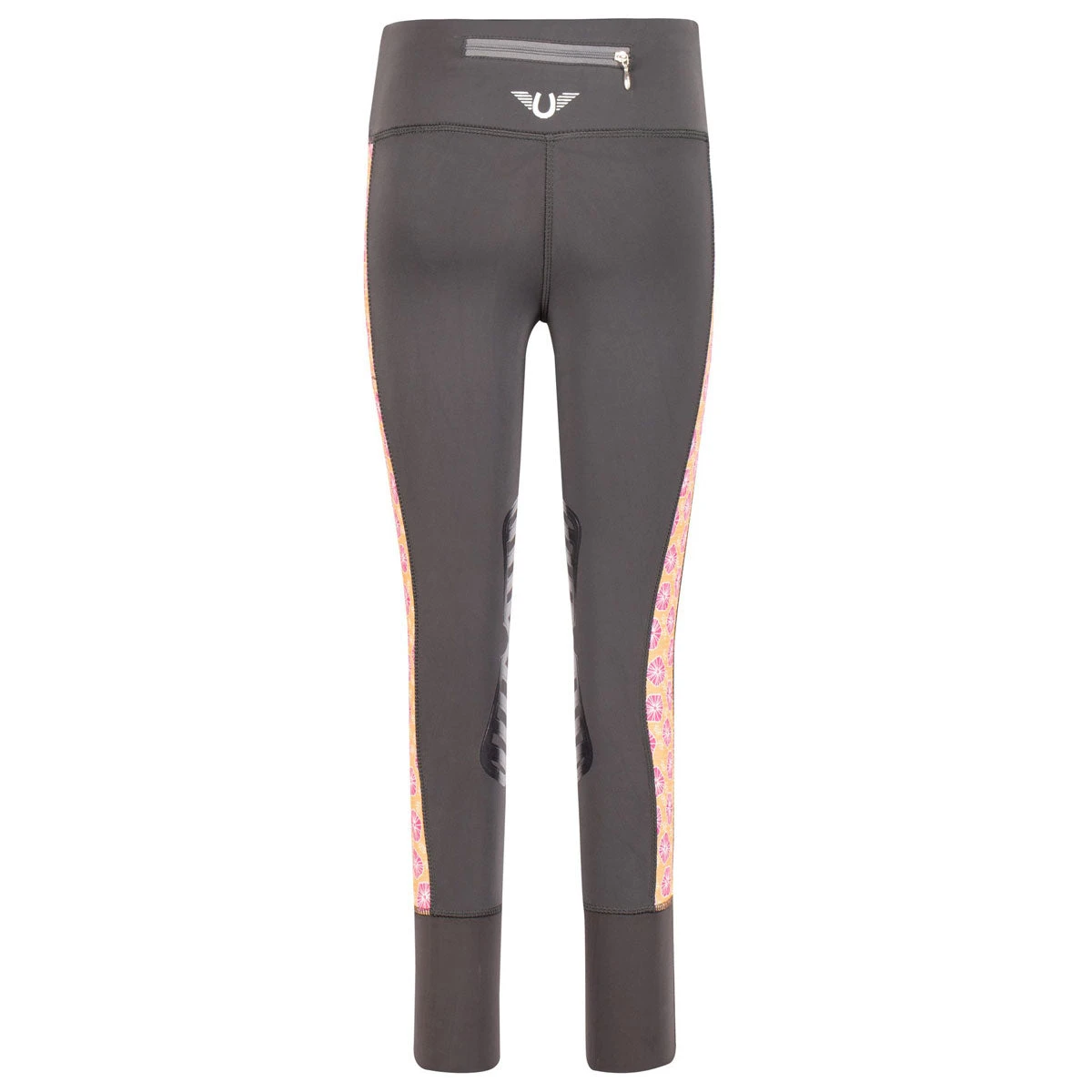 The TuffRider Athena EquiCool Children’s Riding Tights are designed with moisture wicking fabric with a UPF 50 sun protection rating. The ventilated side strip features a tropical pattern and allows better airflow while staying stylish. Great for schooling, fun shows and lessons, these pull-on tights include silicone knee patches that and contoured sock bottoms to suit any leg length. Zipper back pocket on the waistband can store treats and more!
